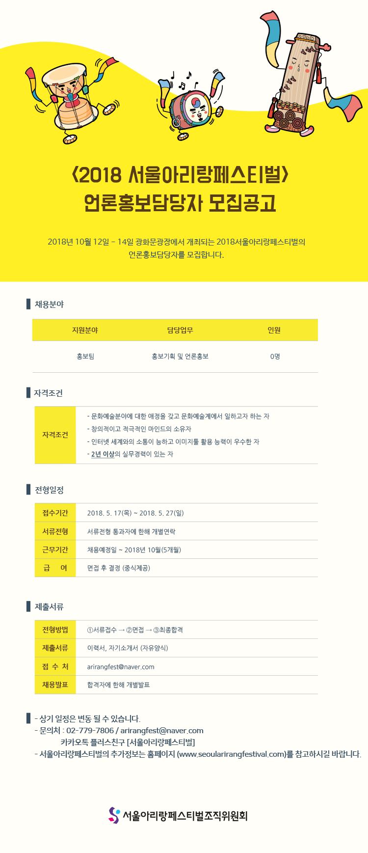 2018서울아리랑페스티벌 언론홍보담당자 모집 - 2018년 10월 12일 ~ 14일 광화문광장에서 개최되는 2018서울아리랑페스티벌의 언론홍보담당자를 모집합니다.
